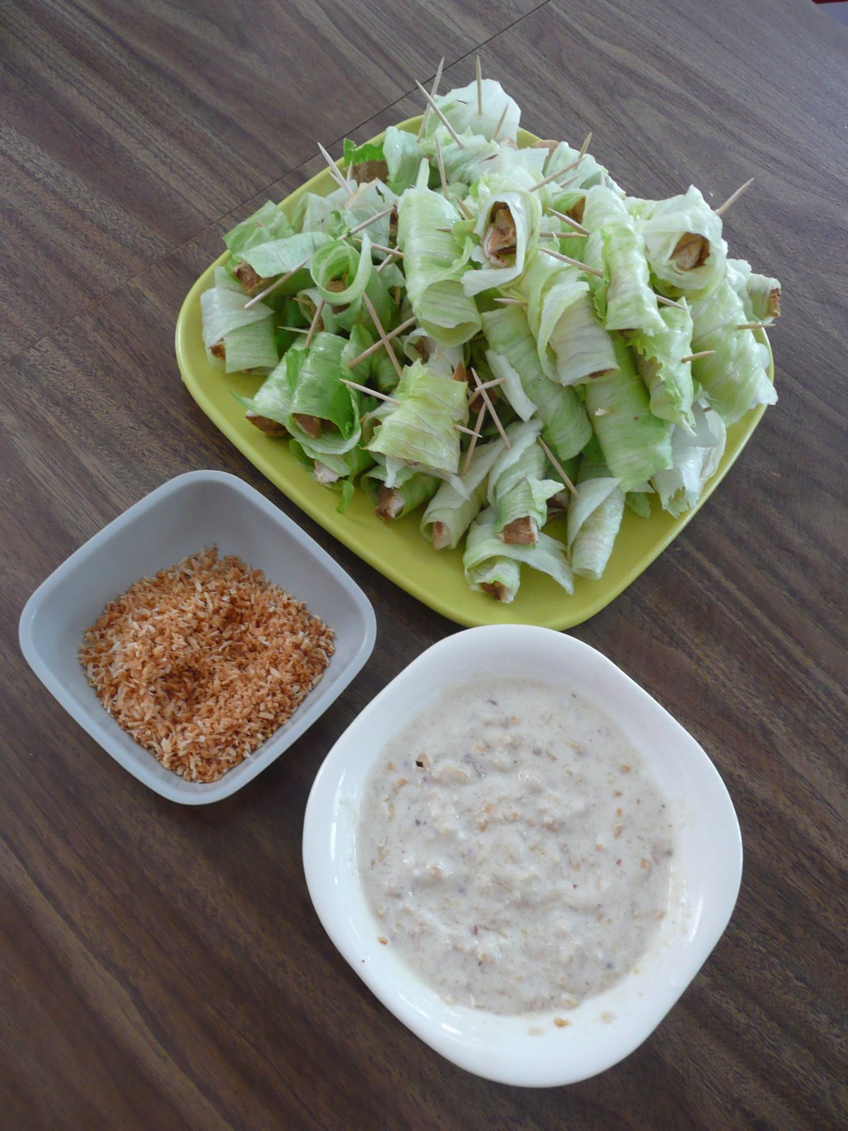 TIPS: I had a heck of a time making these rolls the first time. I soon found a method that is easy. I loosen a whole leaf of lettuce and cut out the rib with a sharp knife. I then cut the leaf into long strips. Sometimes I can get two rolls out of one strip of lettuce. I just tear or cut the lettuce when I'm happy with the amount rolled around the chicken piece. Stiff pieces of lettuce don't roll very easily or they break when you stick them with a toothpick.